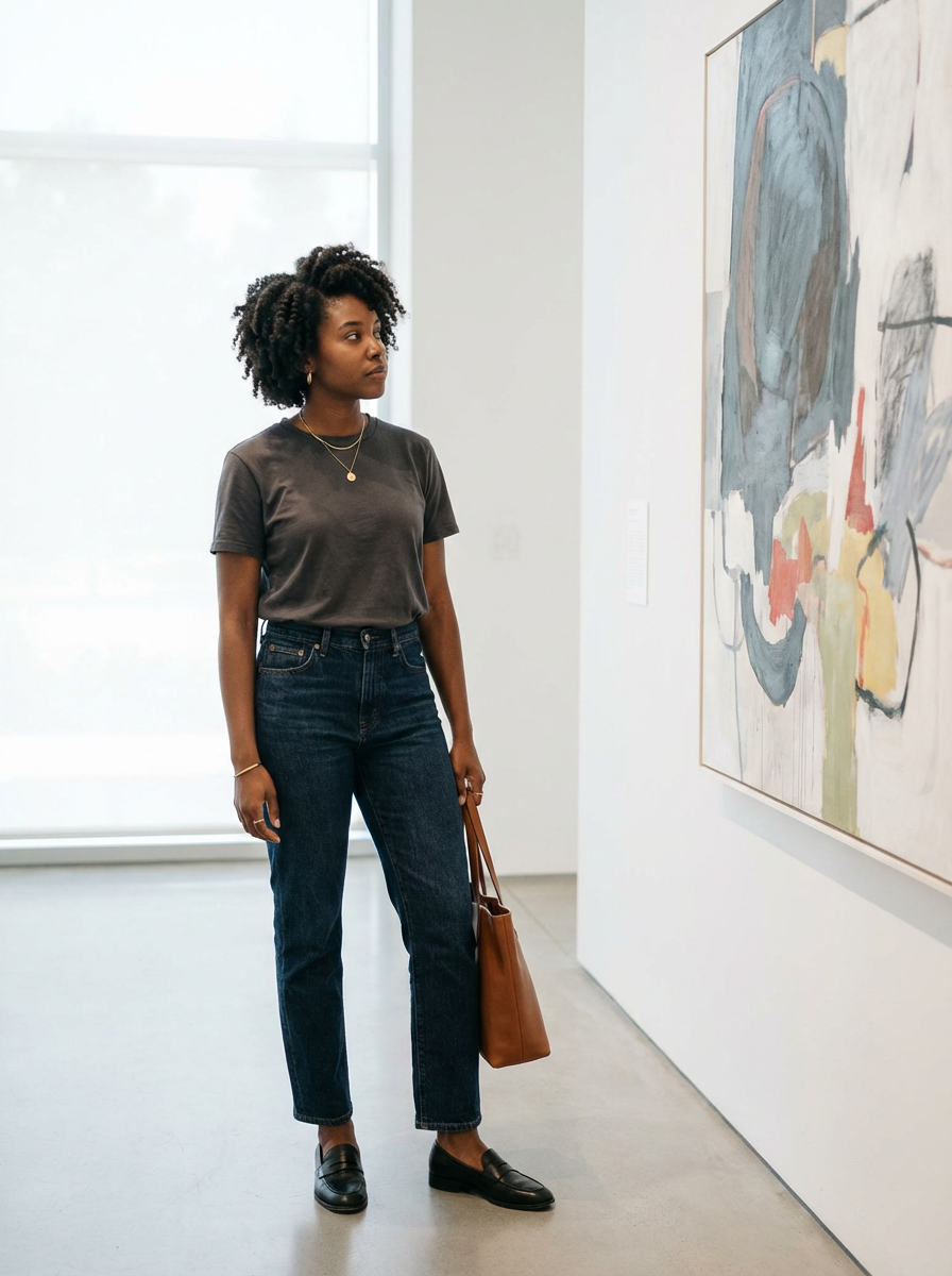model quiet luxury casual, premium cotton t-shirt, perfectly fitted jeans, leather loafers, art gallery setting
