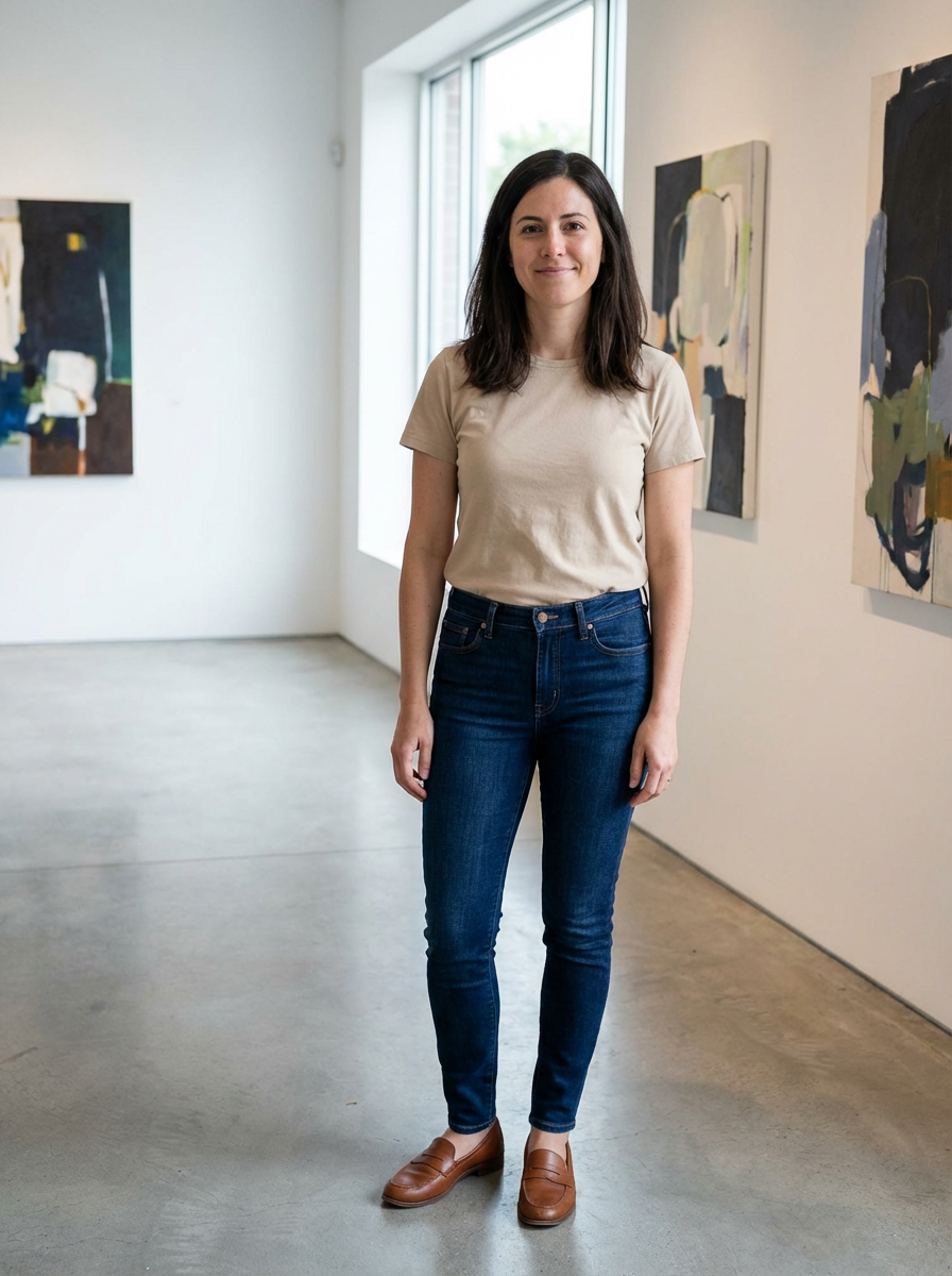 model quiet luxury casual, premium cotton t-shirt, perfectly fitted jeans, leather loafers, art gallery setting