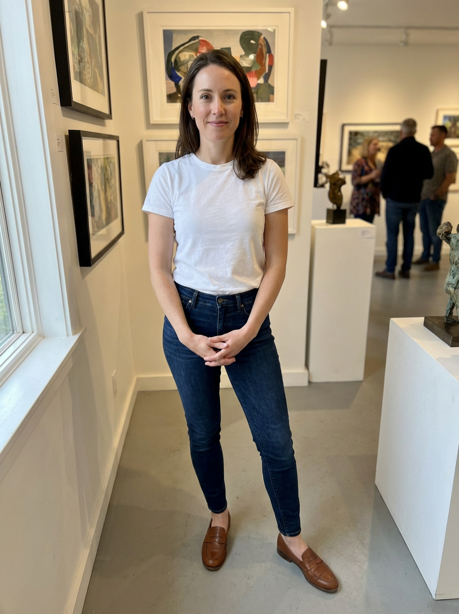 model quiet luxury casual, premium cotton t-shirt, perfectly fitted jeans, leather loafers, art gallery setting