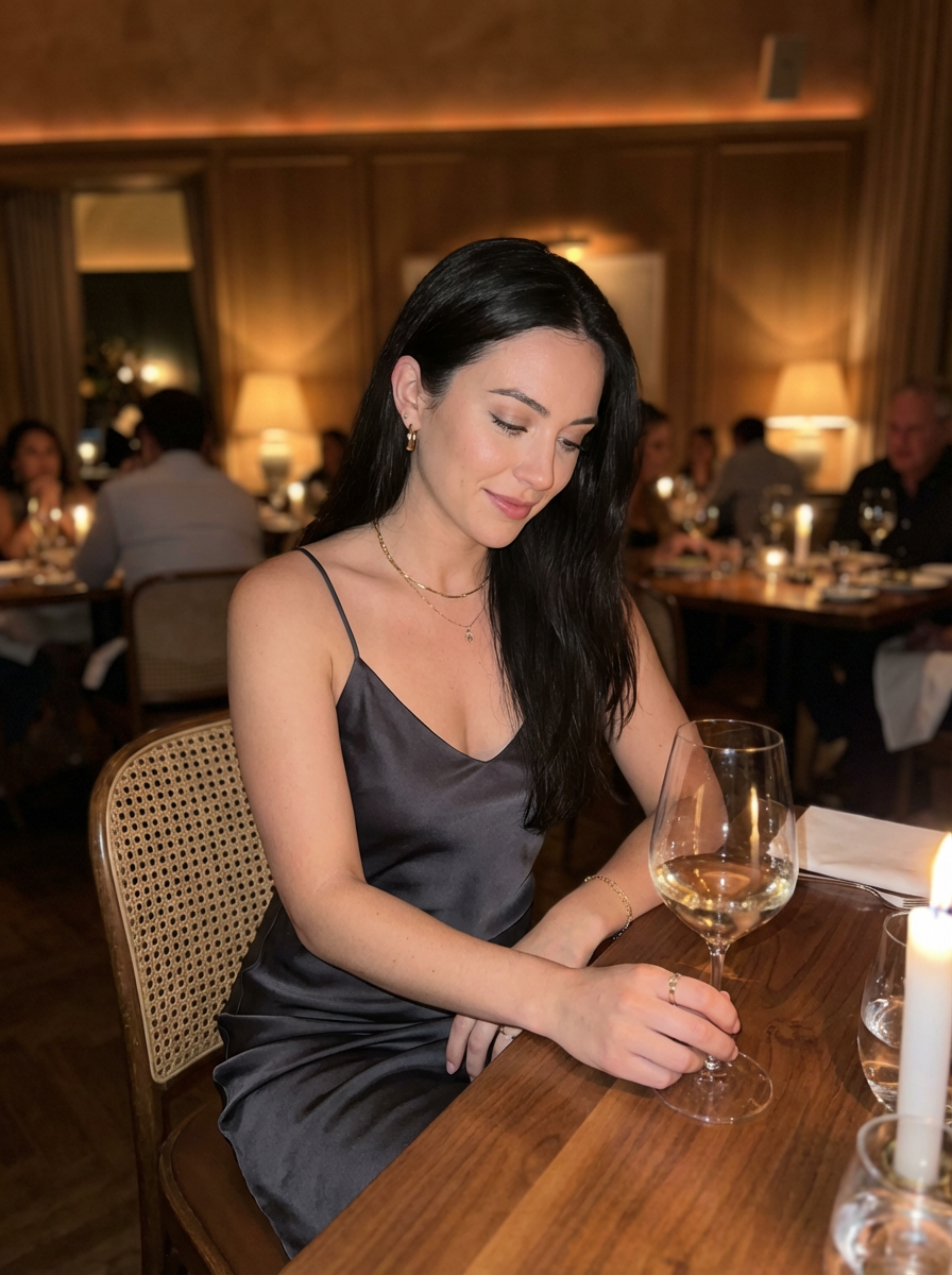 model quiet luxury dinner look, simple silk dress , upscale restaurant, candlelit