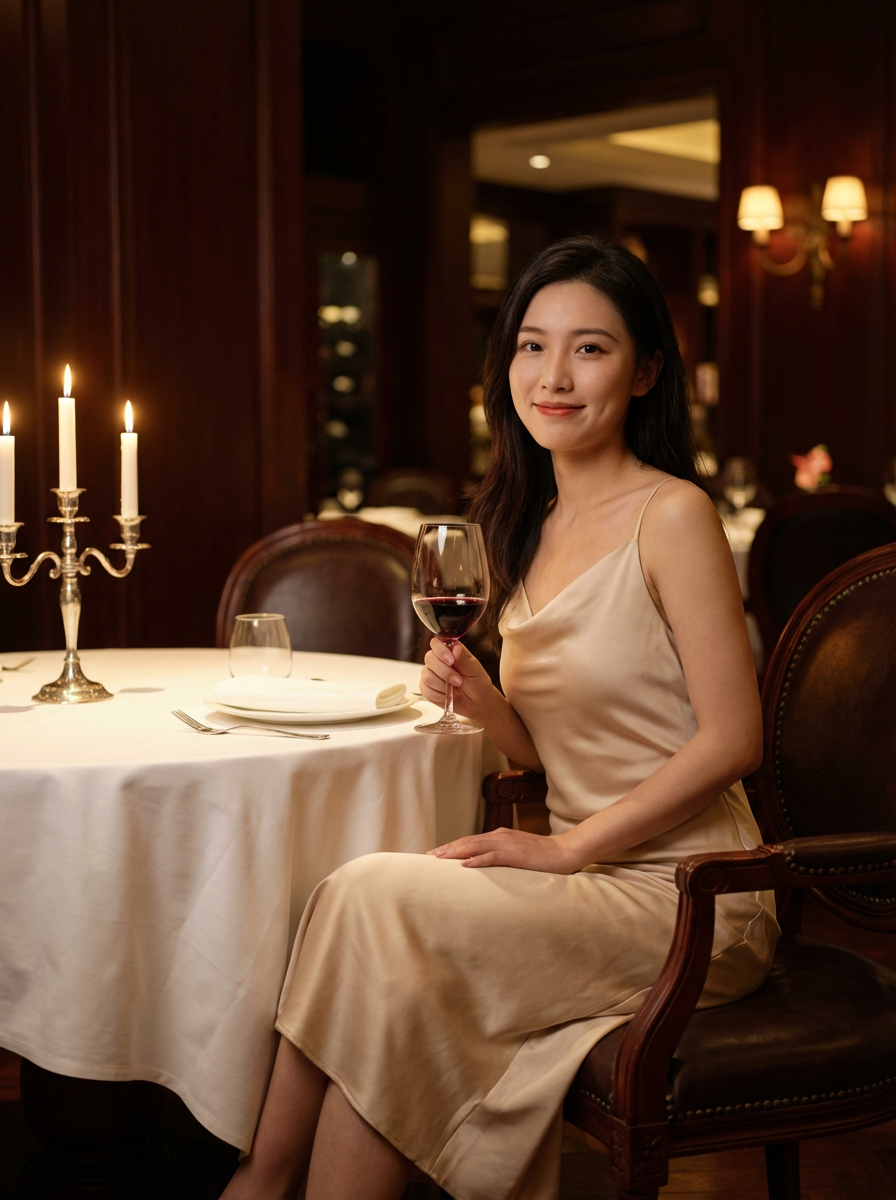 model quiet luxury dinner look, simple silk dress , upscale restaurant, candlelit