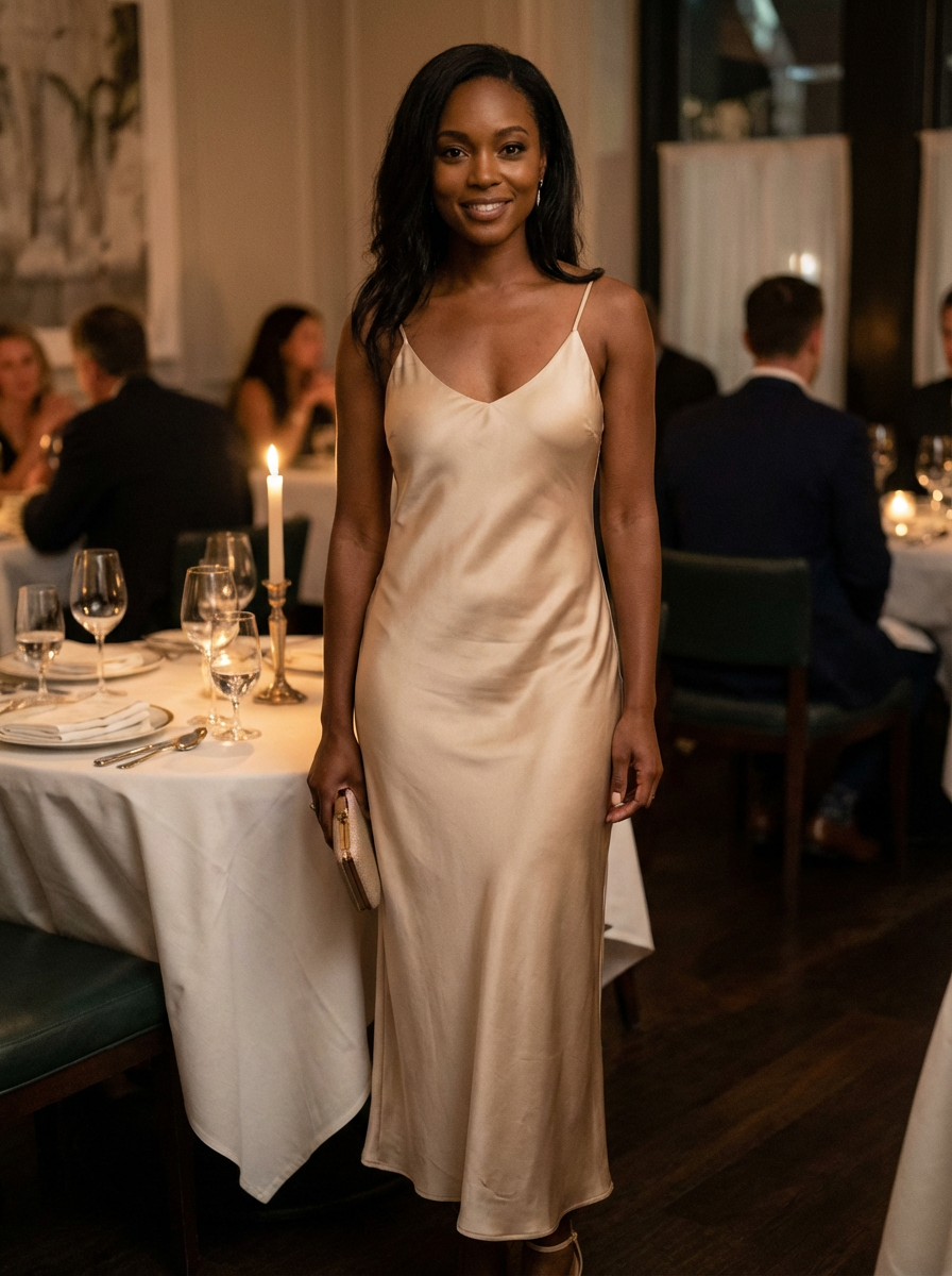 model quiet luxury dinner look, simple silk dress , upscale restaurant, candlelit