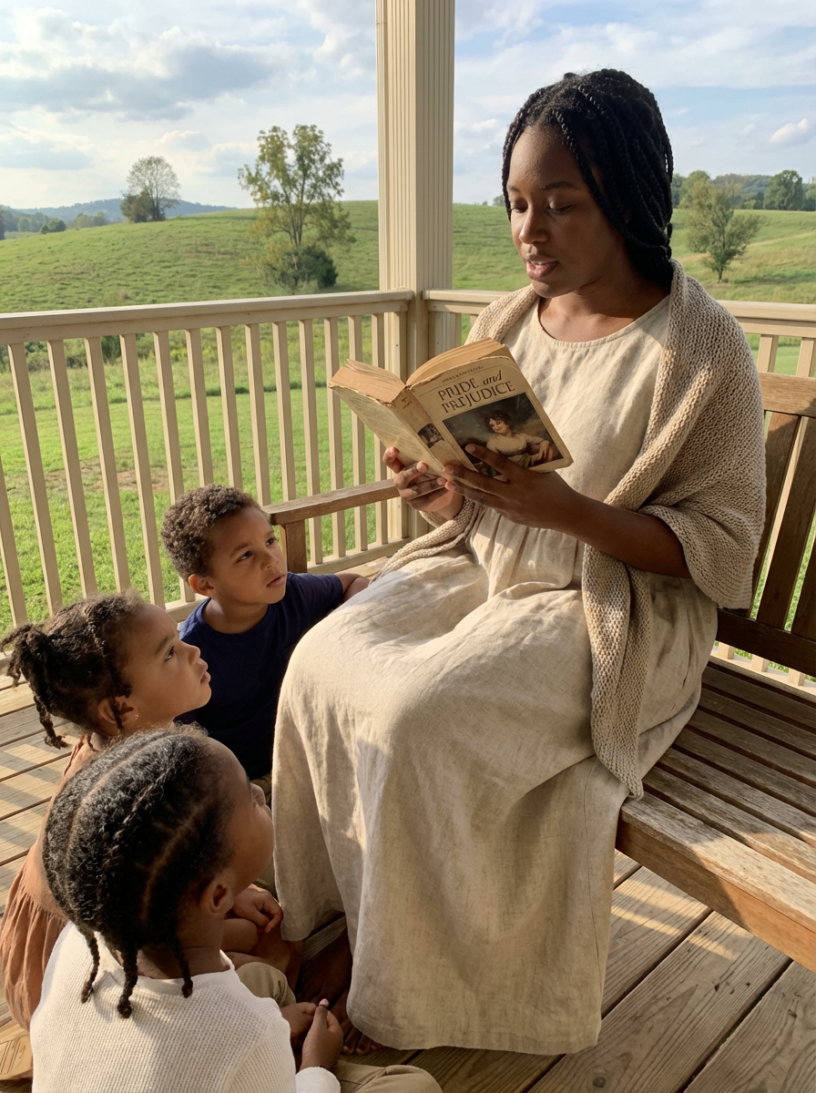 model reading a classic novel on a porch with countryside views to her three children gathered around her, wearing a simple linen dress, with a shawl wrapped around her shoulders, hair in braids