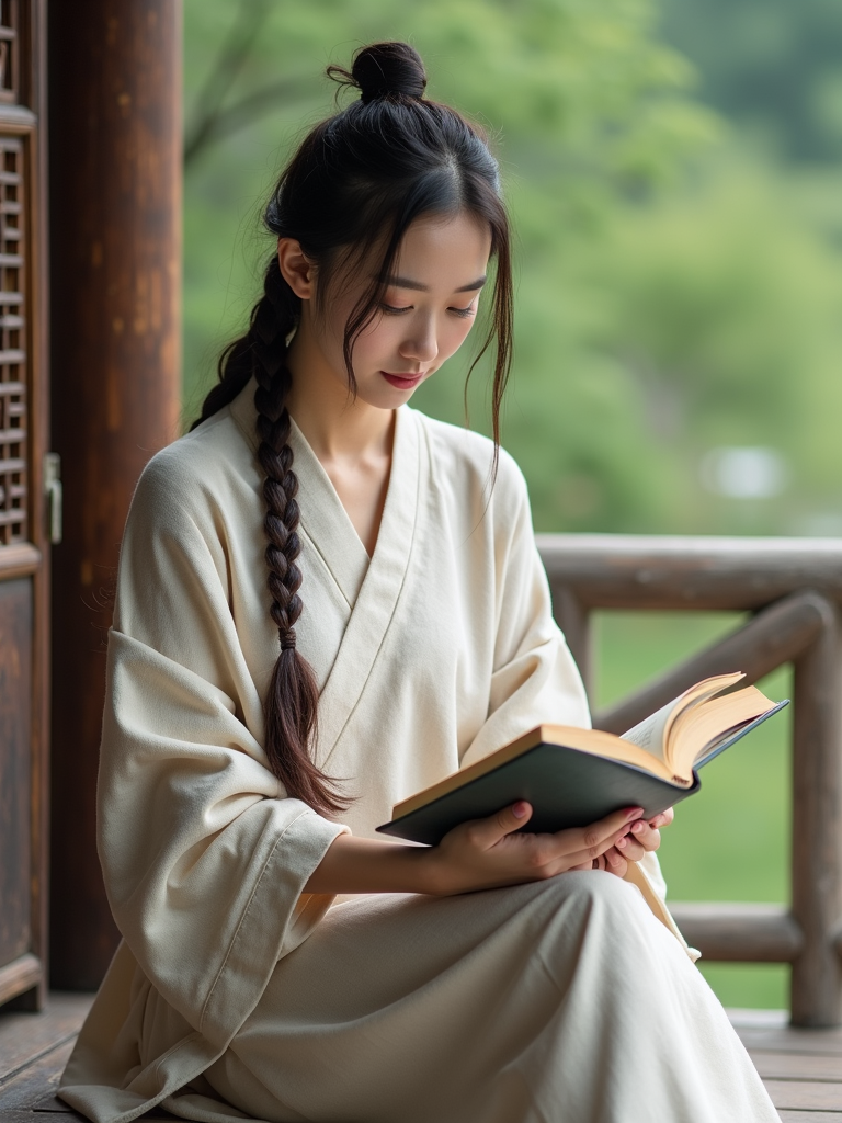 model reading a classic novel on a porch with countryside views, wearing a simple linen dress, with a shawl wrapped around her shoulders, hair in braids