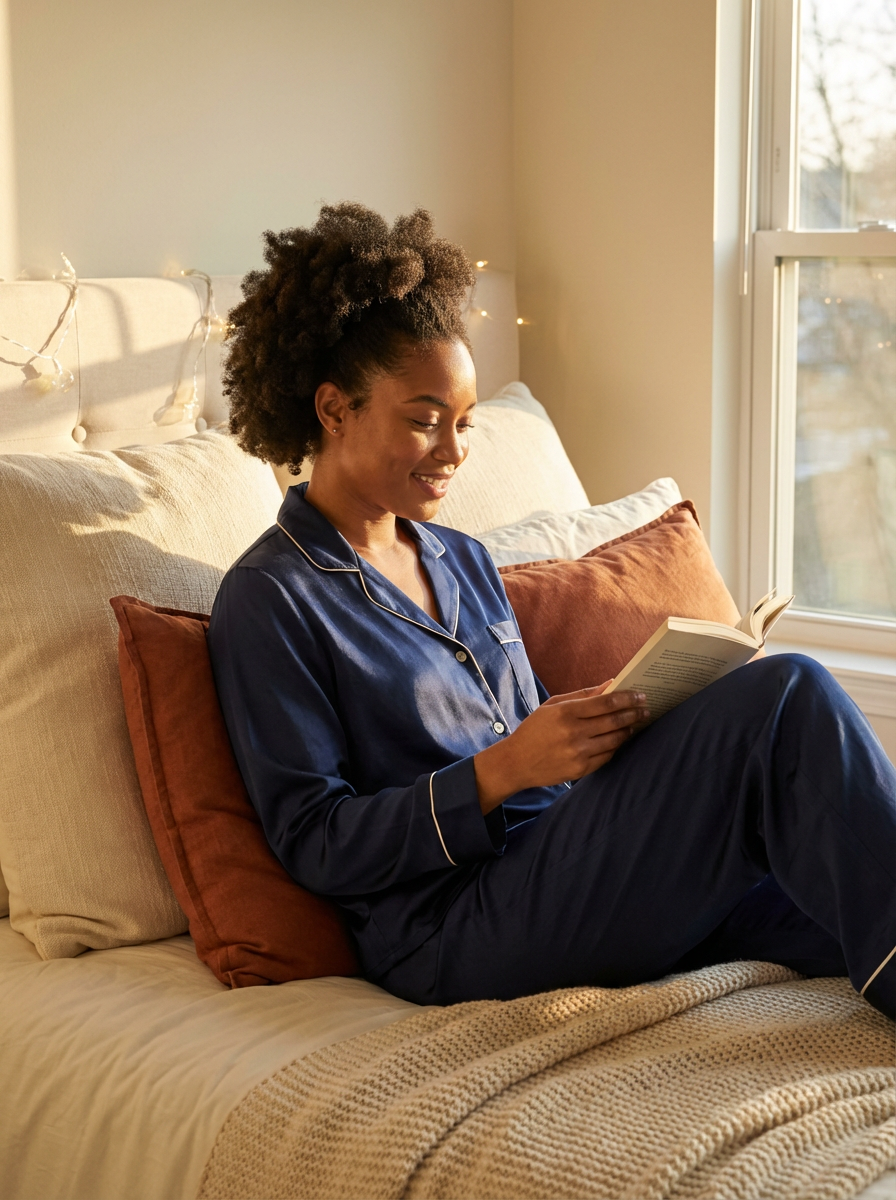 model reading book in bed, wearing silk pajama set , surrounded by soft pillows and blankets, fairy lights in background, golden hour lighting, peaceful weekend morning