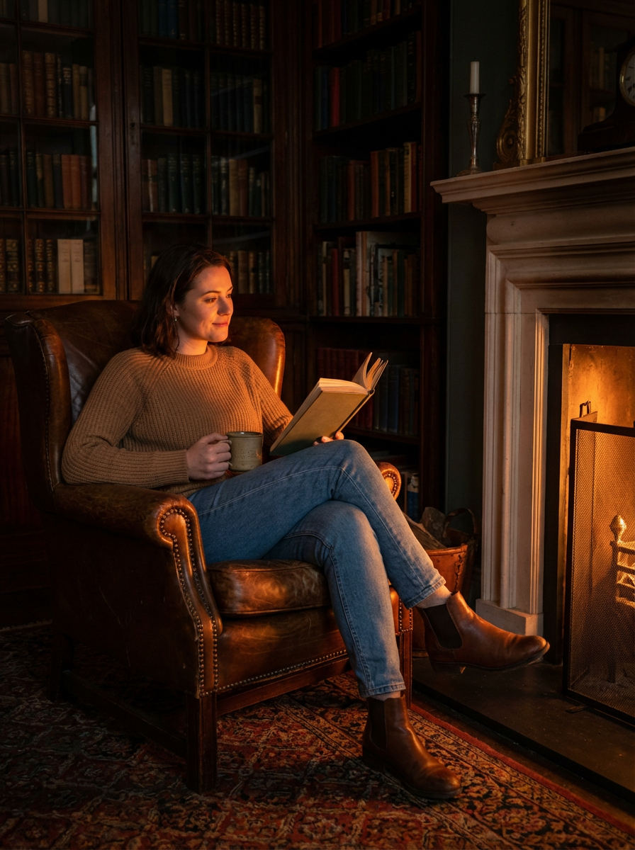 model reading in dark academia setting, leather armchair, fireplace glow, warm amber lighting, cozy intellectual vibe