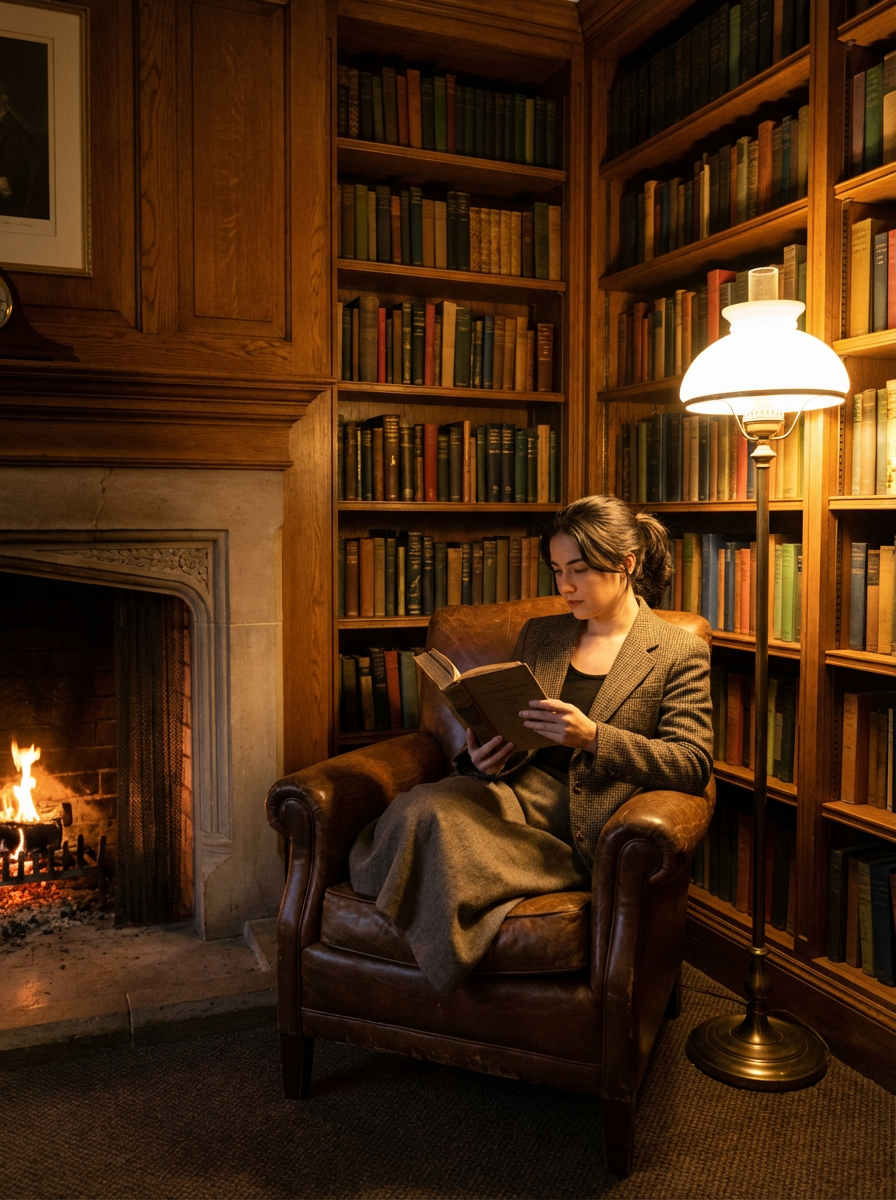 model reading in dark academia setting, leather armchair, fireplace glow, warm amber lighting, cozy intellectual vibe