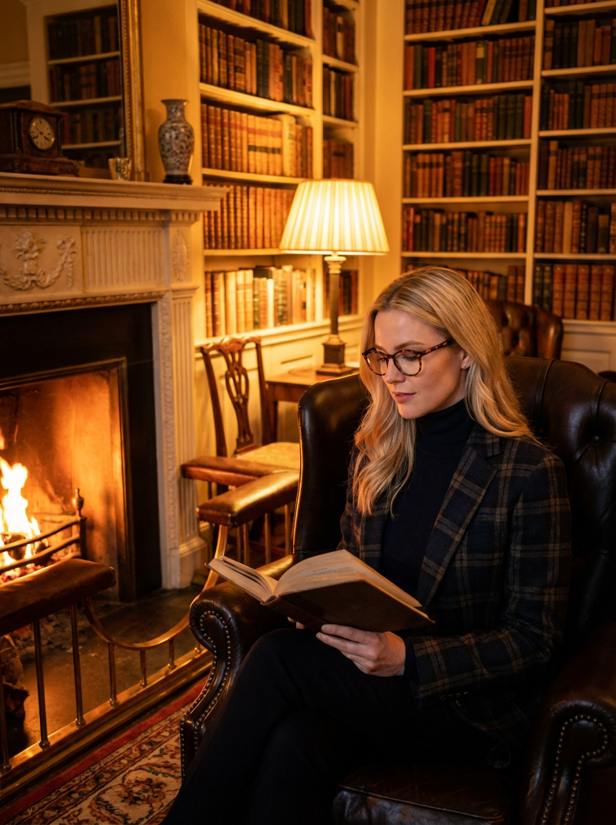 model reading in dark academia setting, leather armchair, fireplace glow, warm amber lighting, cozy intellectual vibe