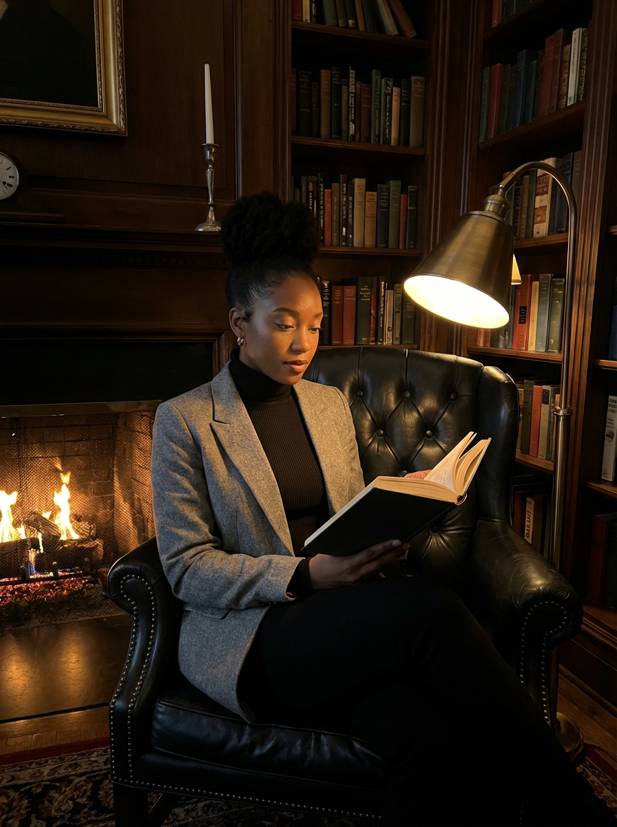 model reading in dark academia setting, leather armchair, fireplace glow, warm amber lighting, cozy intellectual vibe