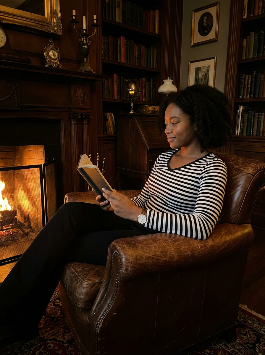 model reading in dark academia setting, leather armchair, fireplace glow, warm amber lighting, cozy intellectual vibe