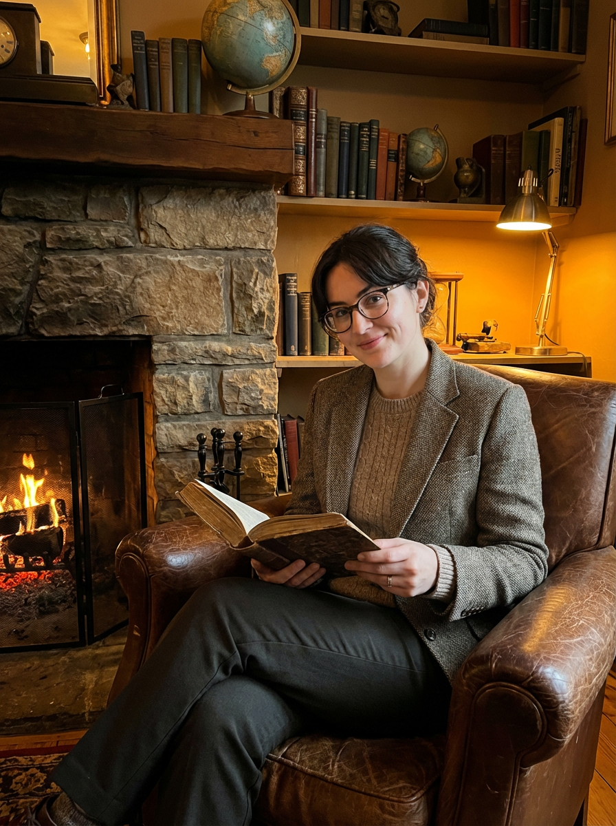 model reading in dark academia setting, leather armchair, fireplace glow, warm amber lighting, cozy intellectual vibe