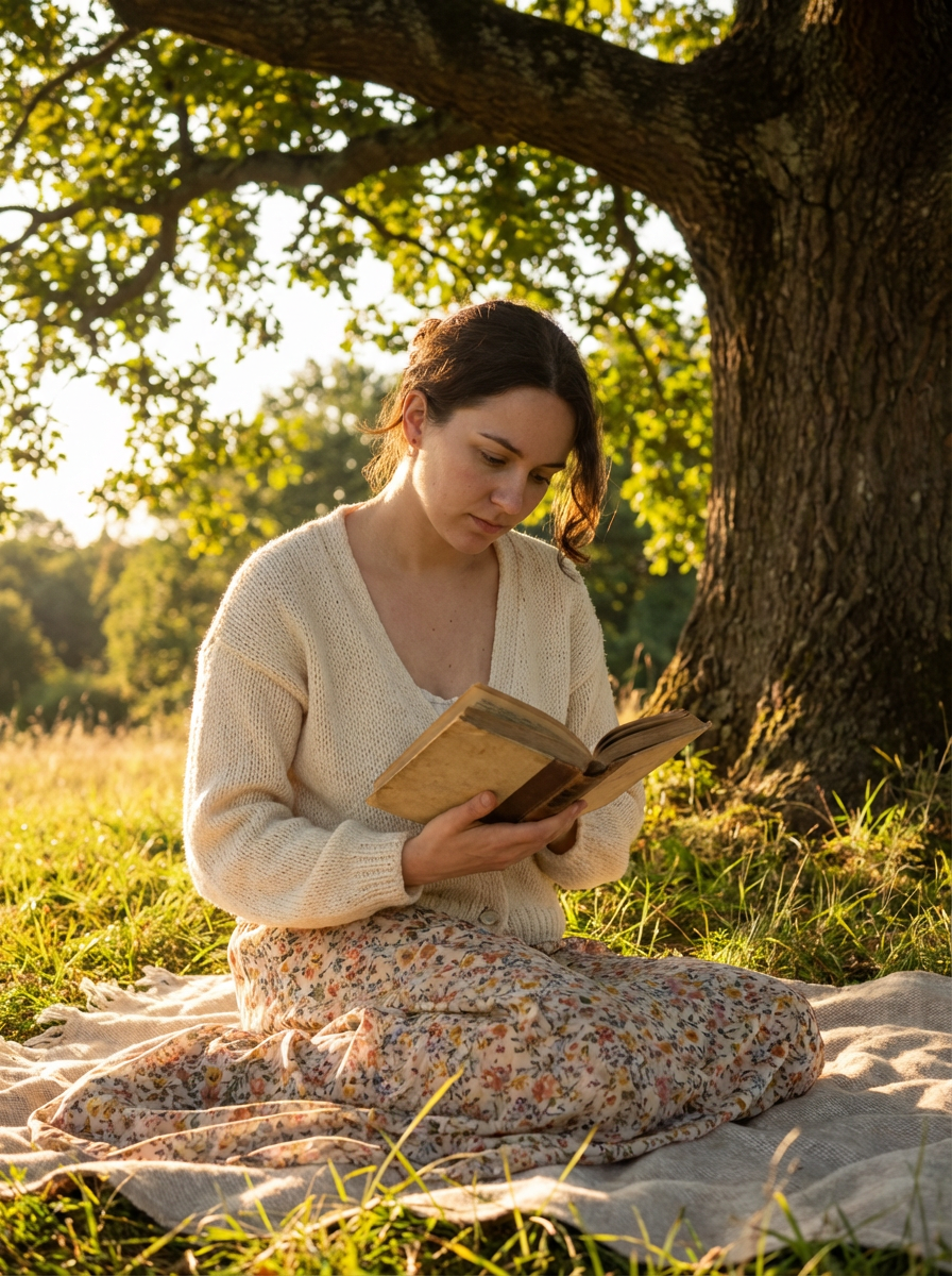model reading under tree, cottagecore style, flowing skirt, handmade knit cardigan, golden hour meadow