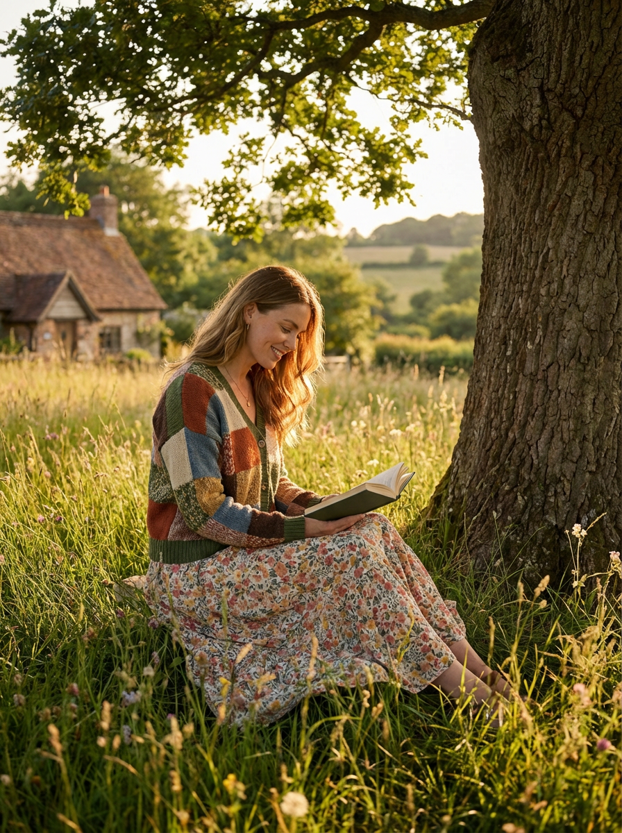 model reading under tree, cottagecore style, flowing skirt, handmade knit cardigan, golden hour meadow