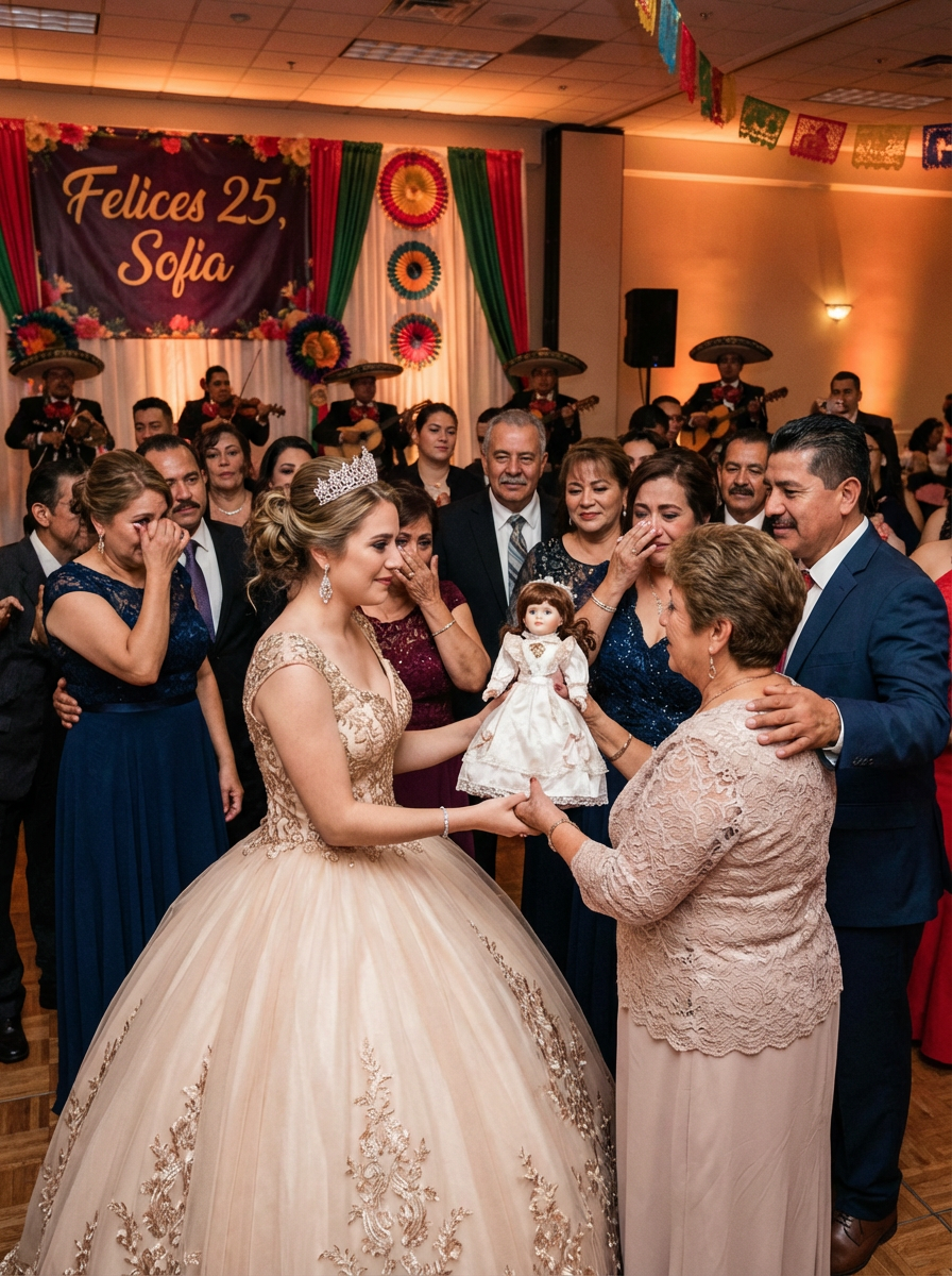 model receiving last doll, quinceanera tradition, emotional meaningful moment, family gathered