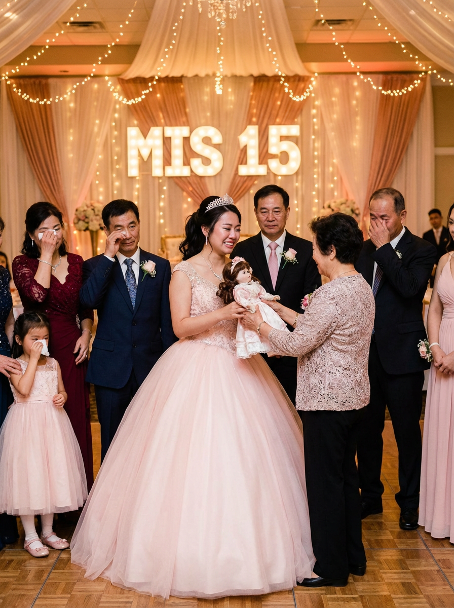 model receiving last doll, quinceanera tradition, emotional meaningful moment, family gathered
