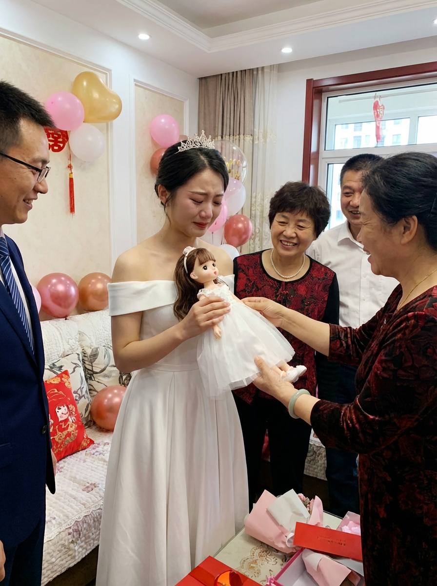 model receiving last doll, quinceanera tradition, emotional meaningful moment, family gathered