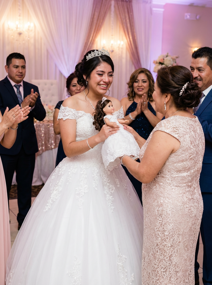 model receiving last doll, quinceanera tradition, emotional meaningful moment, family gathered