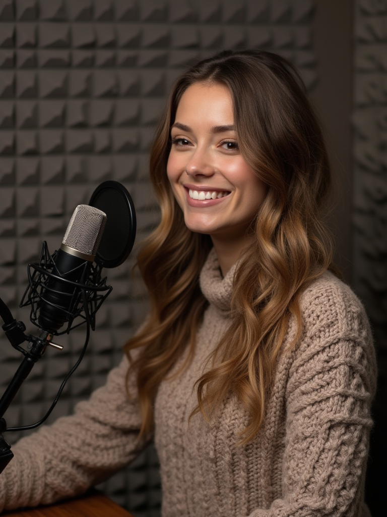model recording podcast, wearing comfortable sweater , large microphone in front, soundproofing panels in background, professional studio setup, engaging expression