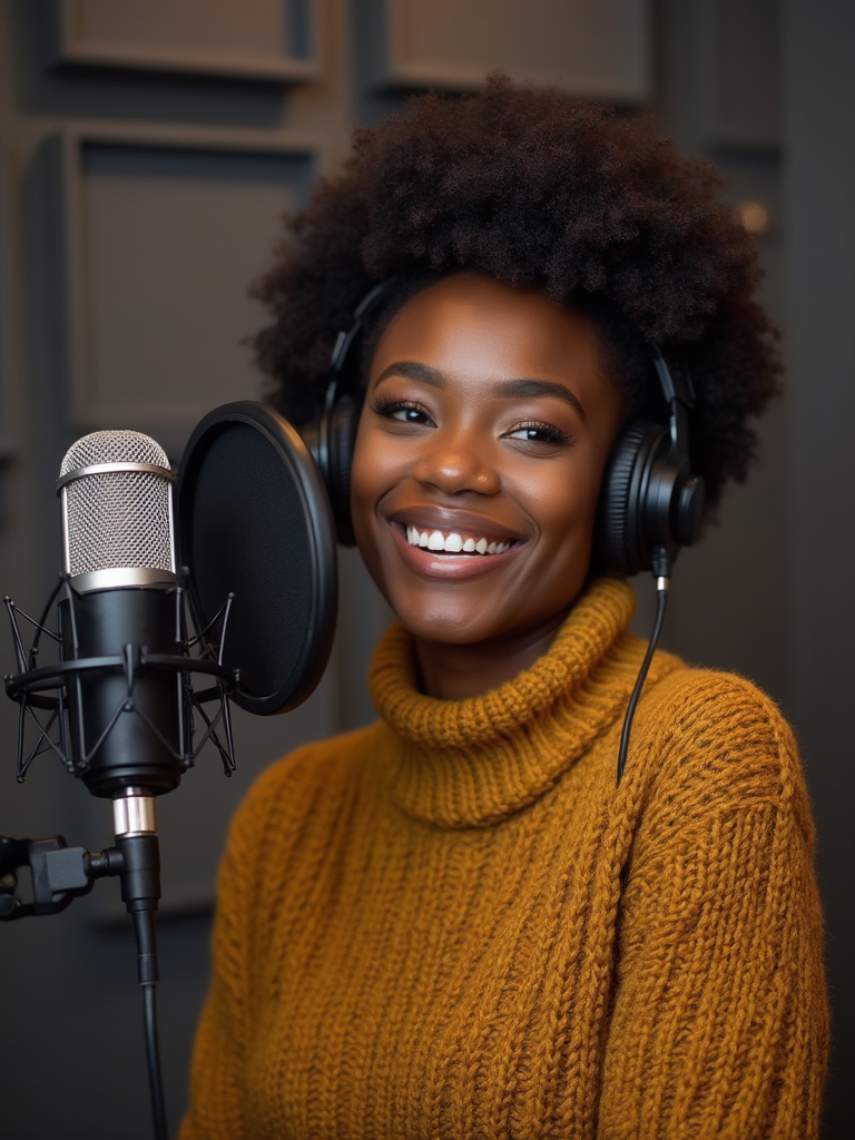 model recording podcast, wearing comfortable sweater , large microphone in front, soundproofing panels in background, professional studio setup, engaging expression