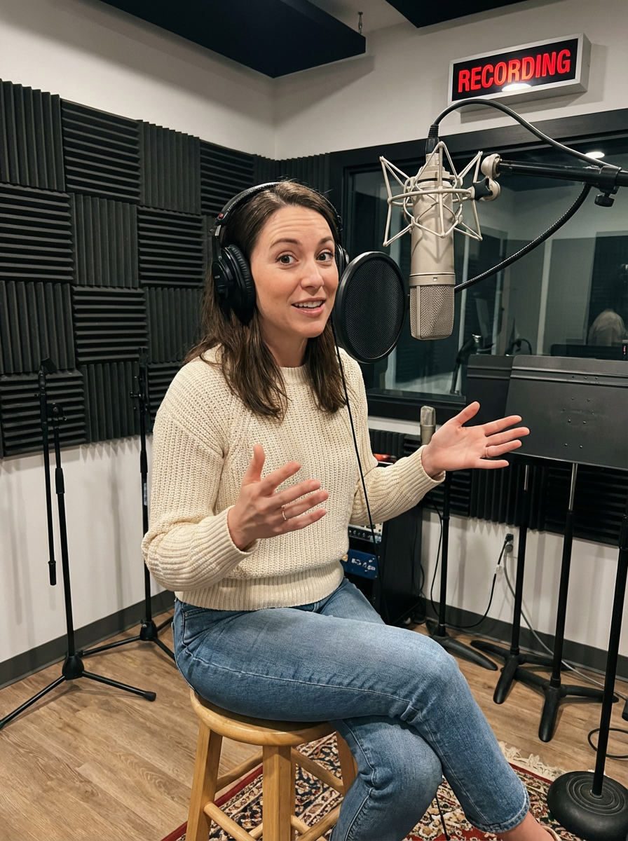 model recording podcast, wearing comfortable sweater , large microphone in front, soundproofing panels in background, professional studio setup, engaging expression