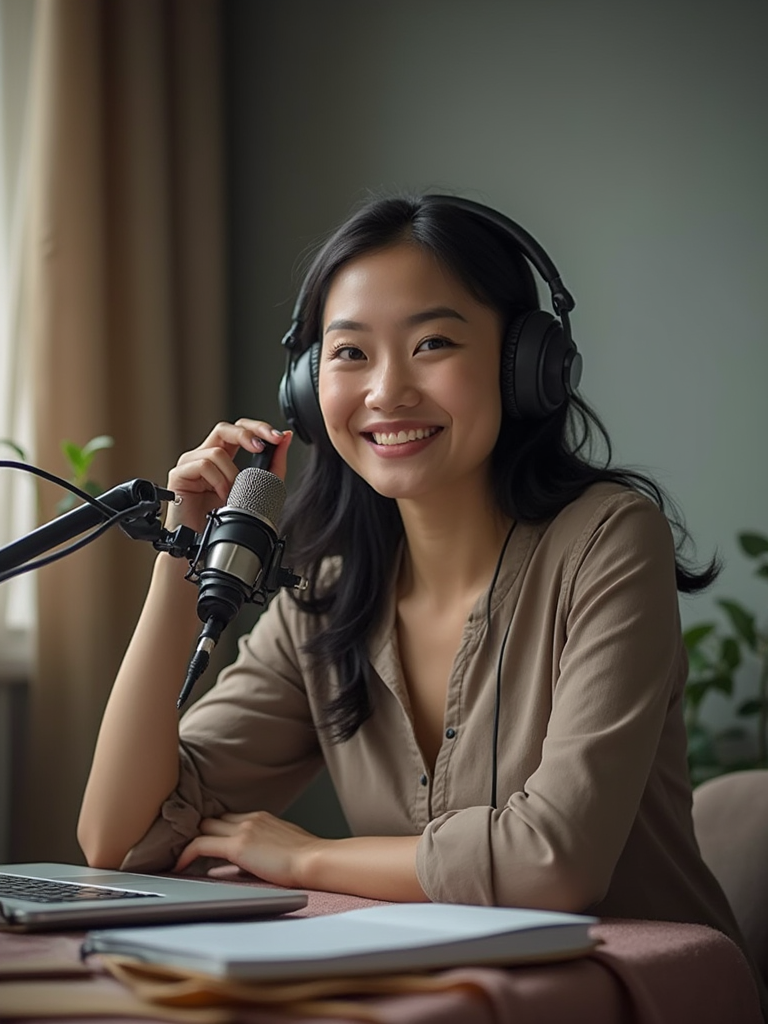 model recording solo podcast, wearing trendy top , dynamic arm microphone, laptop and notes visible, energetic expression, modern studio environment