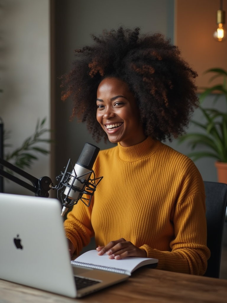 model recording solo podcast, wearing trendy top , dynamic arm microphone, laptop and notes visible, energetic expression, modern studio environment