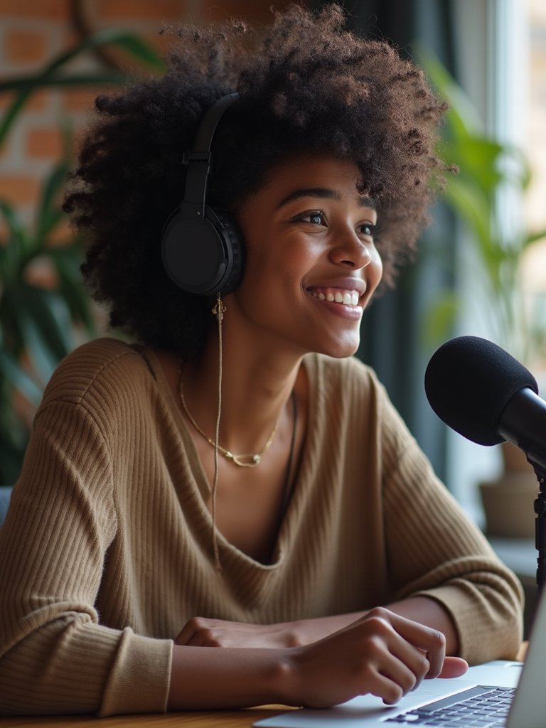 model recording solo podcast, wearing trendy top , dynamic arm microphone, laptop and notes visible, energetic expression, modern studio environment