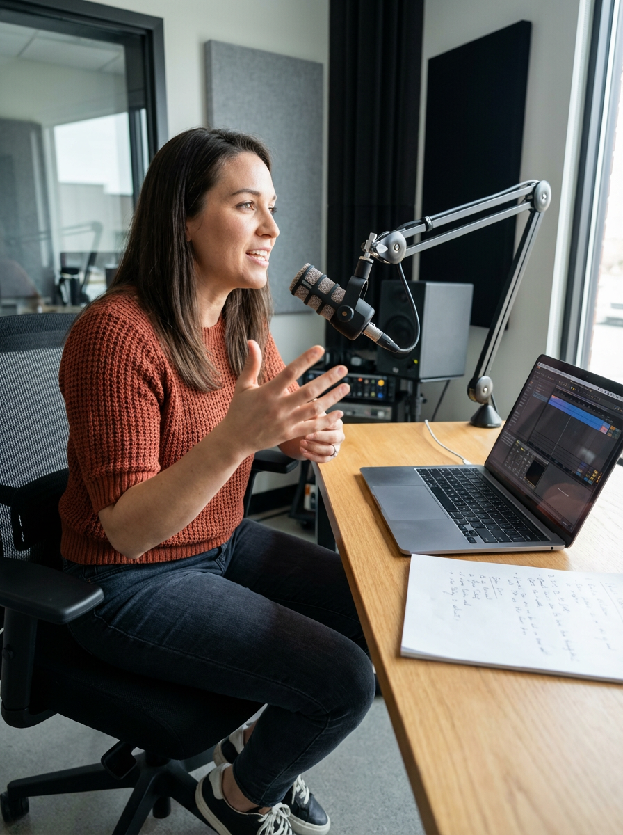model recording solo podcast, wearing trendy top , dynamic arm microphone, laptop and notes visible, energetic expression, modern studio environment