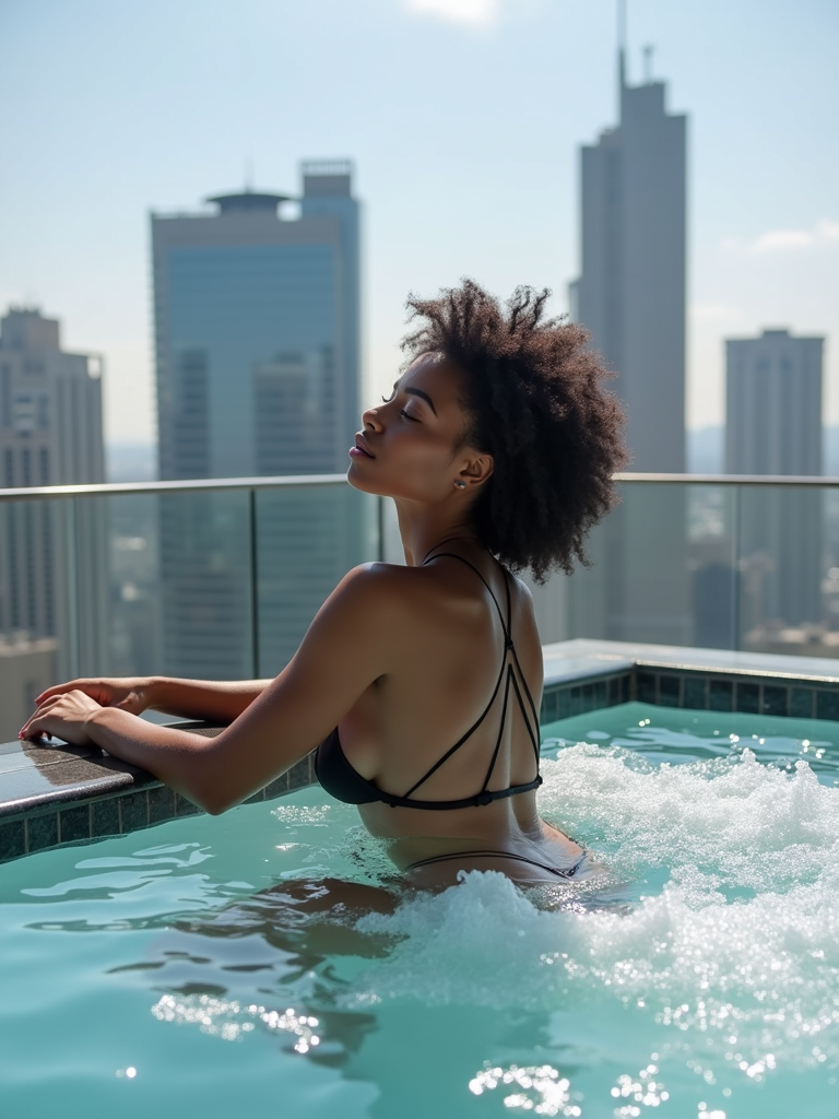 model relaxing in a rooftop jacuzzi with a modern city skyline in the background. womans leans casually on the edge of the jacuzzi, with water bubbling around them. The backdrop showcases tall skyscrapers and an urban environment under bright daylight, creating a luxurious, high-end vibe.