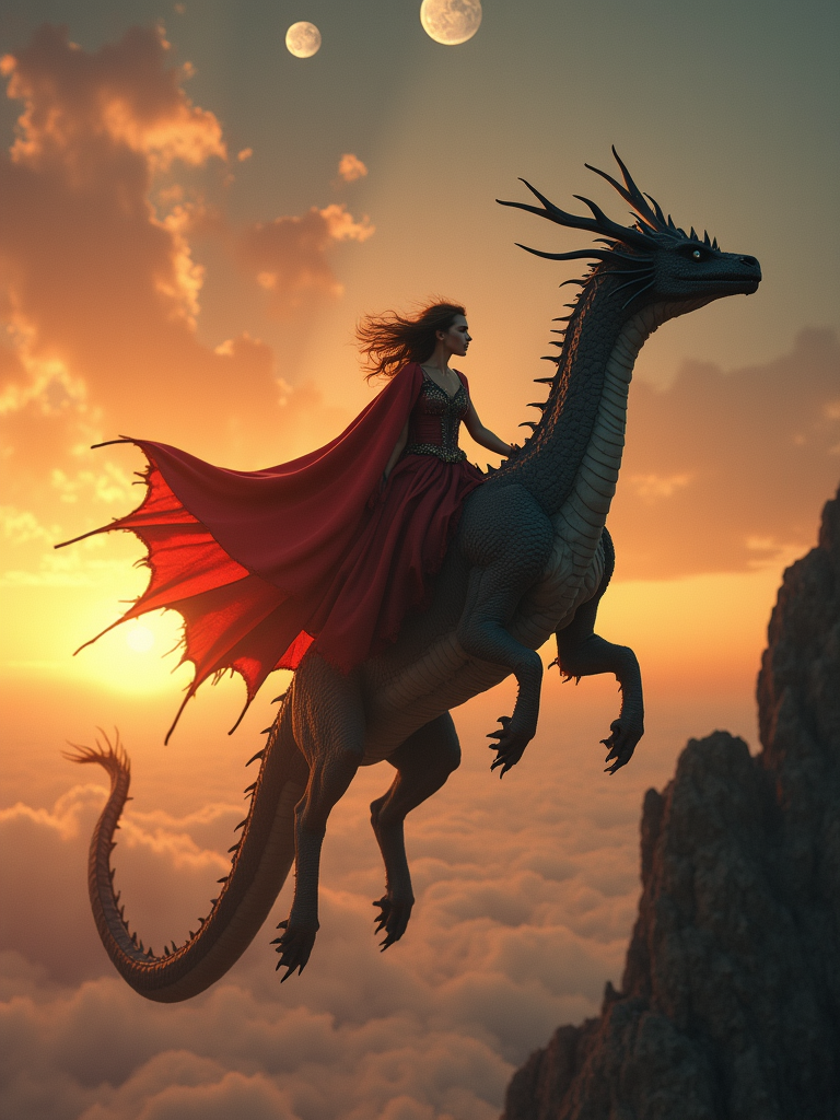 model riding a majestic dragon over a fantasy kingdom, wearing wind-blown adventure gown with cape , dramatic sunset sky with multiple moons visible