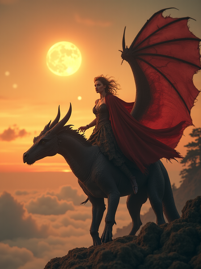 model riding a majestic dragon over a fantasy kingdom, wearing wind-blown adventure gown with cape , dramatic sunset sky with multiple moons visible