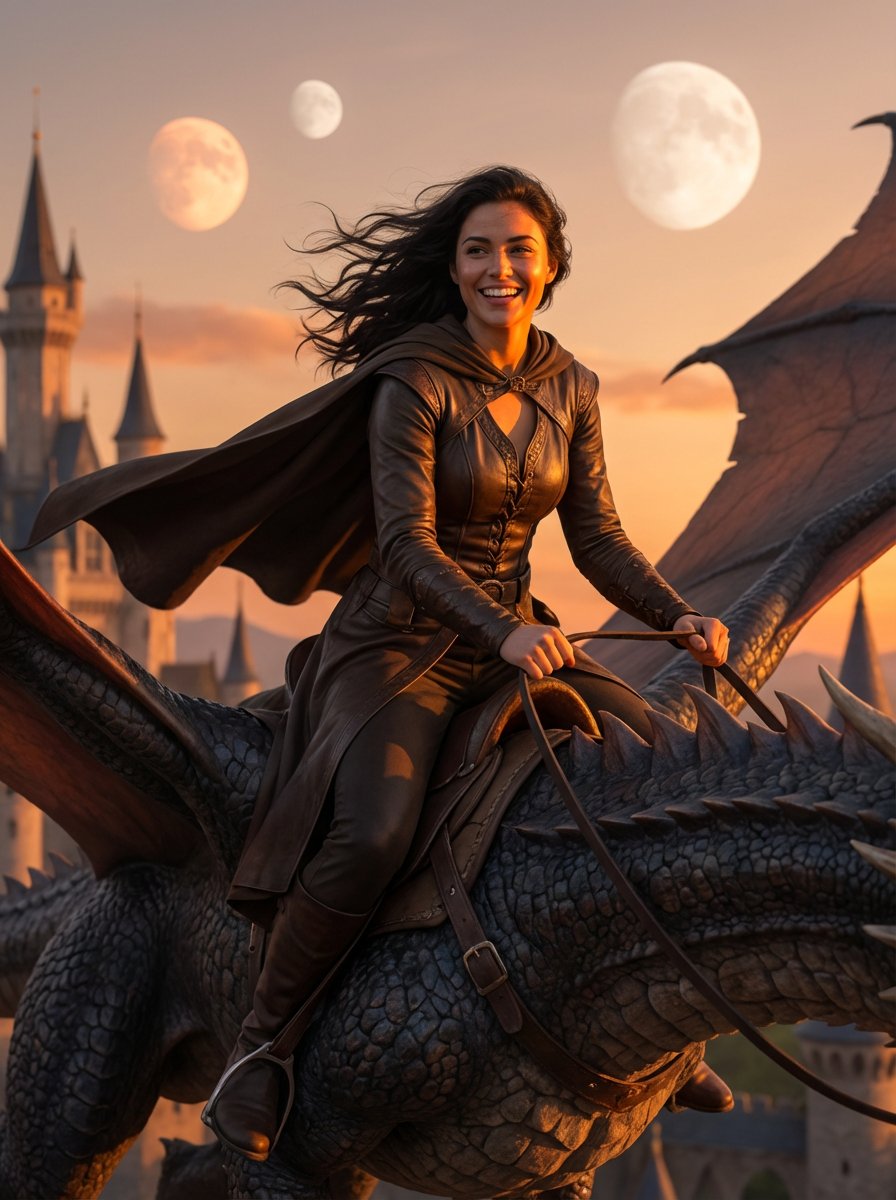 model riding a majestic dragon over a fantasy kingdom, wearing wind-blown adventure gown with cape , dramatic sunset sky with multiple moons visible