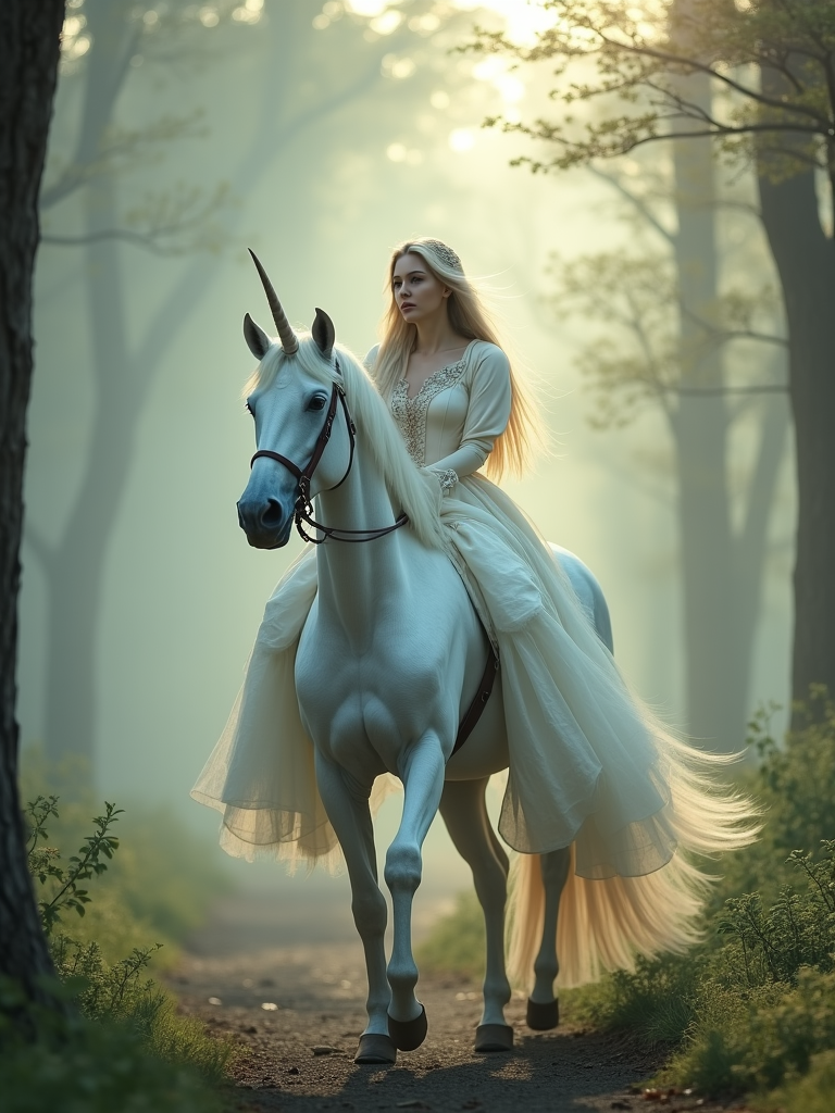 model riding a majestic white unicorn through a misty enchanted forest, wearing a flowing medieval fantasy gown in soft pastels , ethereal morning light creating a dreamlike atmosphere