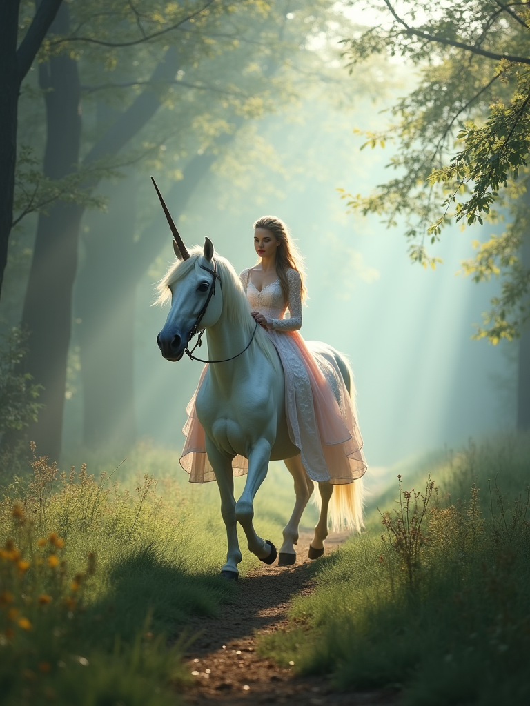 model riding a majestic white unicorn through a misty enchanted forest, wearing a flowing medieval fantasy gown in soft pastels , ethereal morning light creating a dreamlike atmosphere
