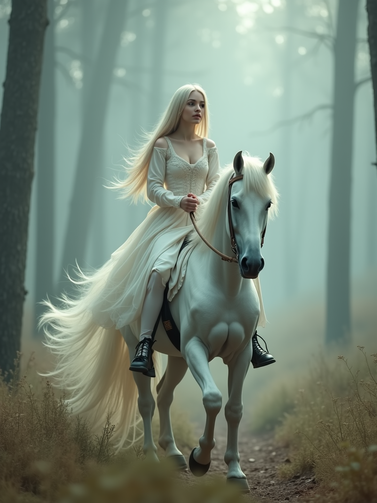 model riding a majestic white unicorn through a misty enchanted forest, wearing a flowing medieval fantasy gown in soft pastels , ethereal morning light creating a dreamlike atmosphere