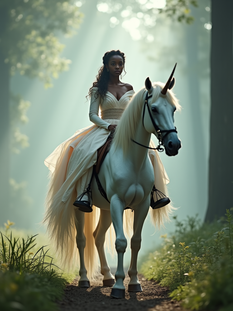 model riding a majestic white unicorn through a misty enchanted forest, wearing a flowing medieval fantasy gown in soft pastels , ethereal morning light creating a dreamlike atmosphere