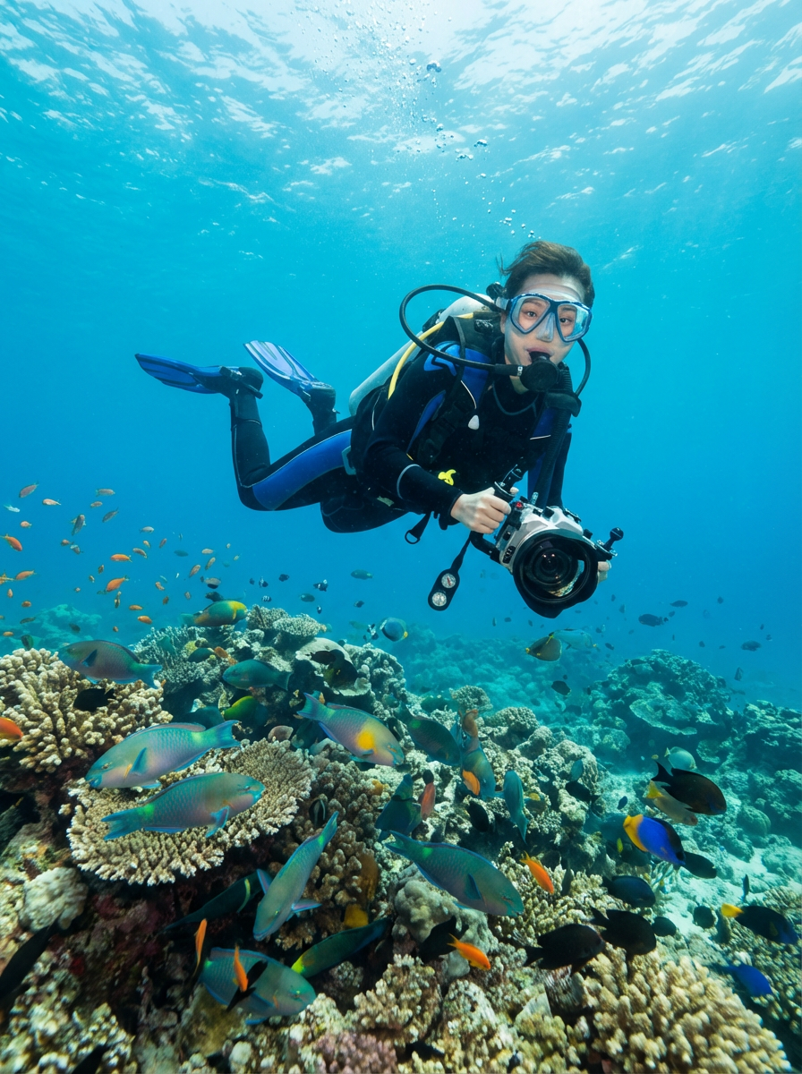 model scuba diving in a stunning coral reef, surrounded by colorful fish