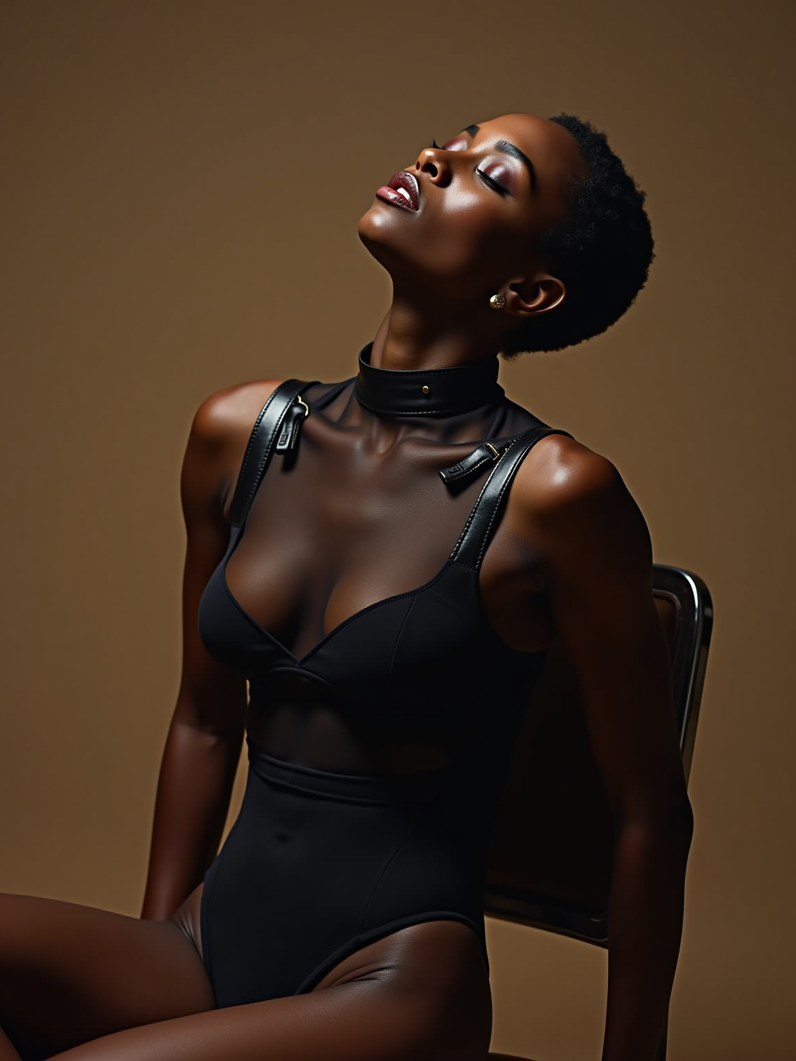 model seated on a modern chair wearing a sheer black bodysuit with structured leather straps and collar. her posture is relaxed but powerful, with her head tilted back and eyes closed. the lighting is warm and moody, with beige tones in the background.