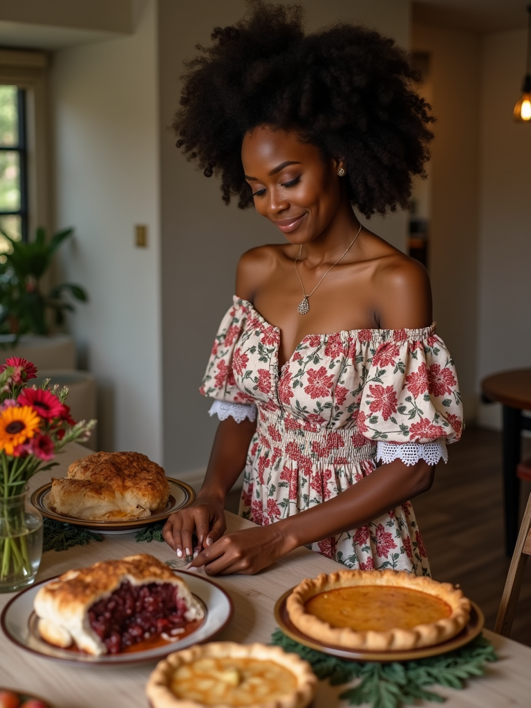 model setting a beautifully arranged table for a holiday meal, wearing a floral off-the-shoulder smocked dress with lace details, carefully placing homemade pies and roasts