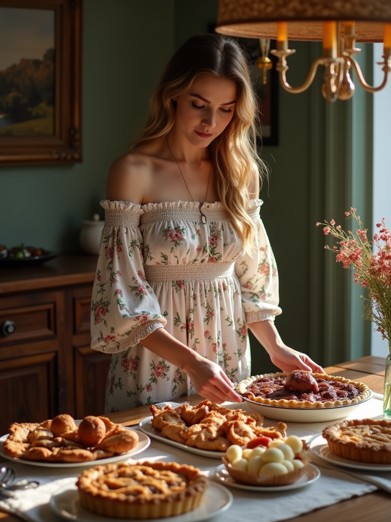 model setting a beautifully arranged table for a holiday meal, wearing a floral off-the-shoulder smocked dress with lace details, carefully placing homemade pies and roasts