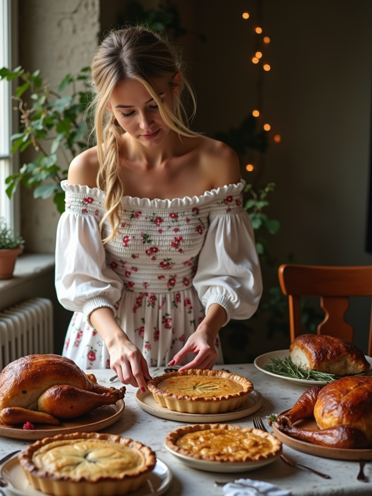 model setting a beautifully arranged table for a holiday meal, wearing a floral off-the-shoulder smocked dress with lace details, carefully placing homemade pies and roasts