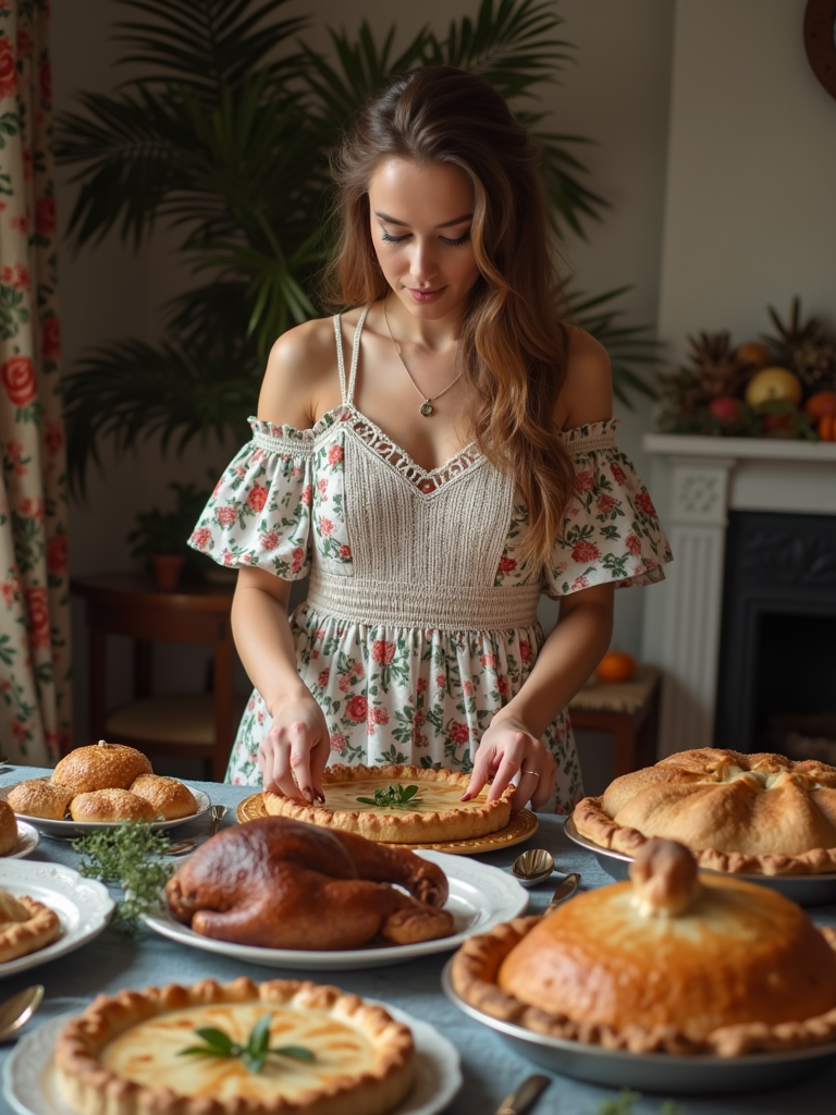 model setting a beautifully arranged table for a holiday meal, wearing a floral off-the-shoulder smocked dress with lace details, carefully placing homemade pies and roasts