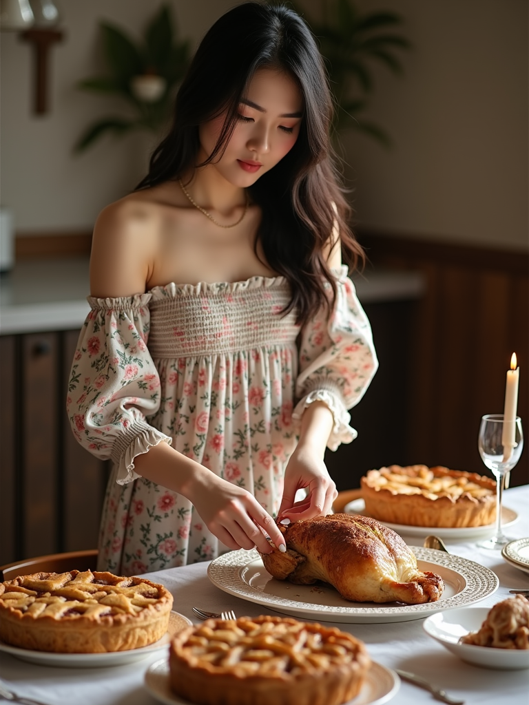 model setting a beautifully arranged table for a holiday meal, wearing a floral off-the-shoulder smocked dress with lace details, carefully placing homemade pies and roasts