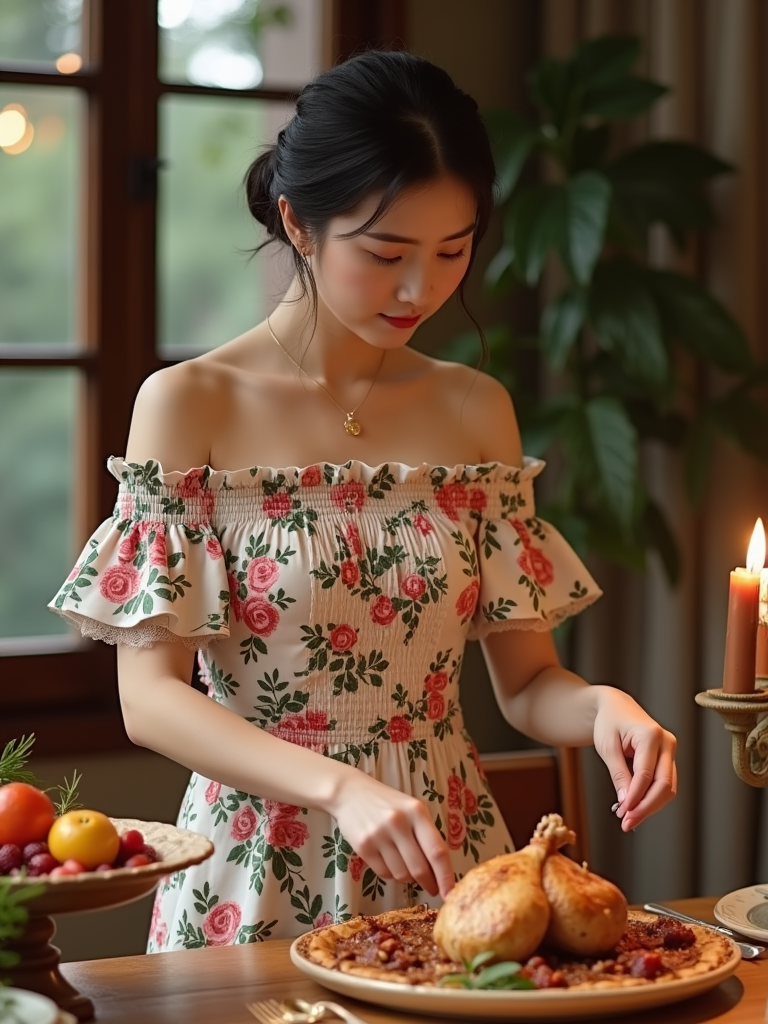 model setting a beautifully arranged table for a holiday meal, wearing a floral off-the-shoulder smocked dress with lace details, carefully placing homemade pies and roasts