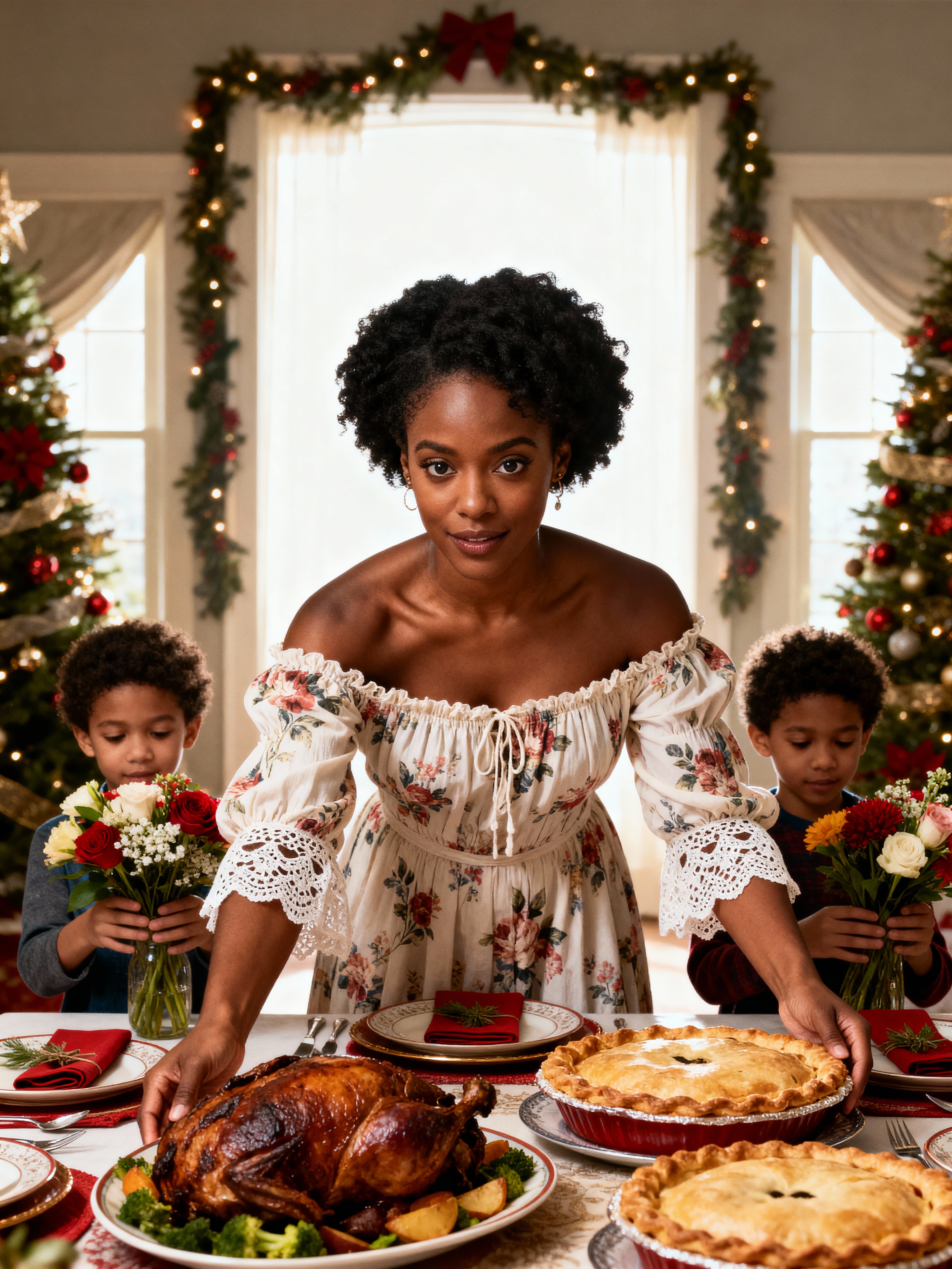 model setting a beautifully arranged table for a holiday meal while her children help arrange flowers, wearing a floral off-the-shoulder smocked dress with lace details, carefully placing homemade pies and roasts
