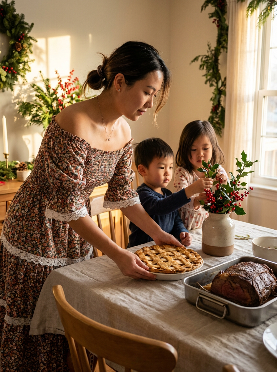 model setting a beautifully arranged table for a holiday meal while her children help arrange flowers, wearing a floral off-the-shoulder smocked dress with lace details, carefully placing homemade pies and roasts
