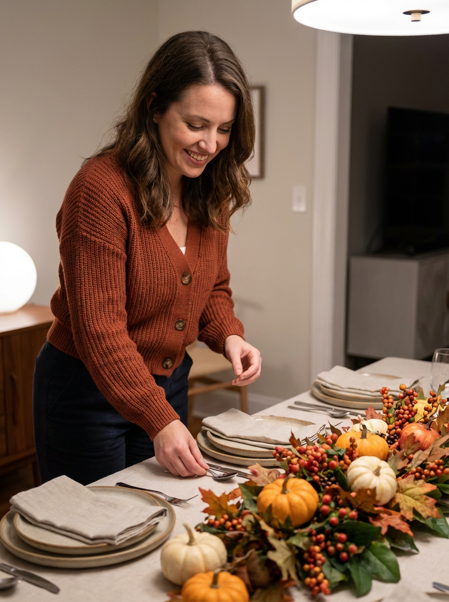 model setting holiday table, beautiful autumn centerpiece, elegant casual attire, hosting preparation