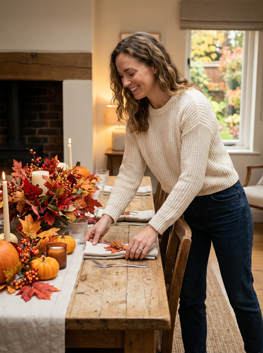 model setting holiday table, beautiful autumn centerpiece, elegant casual attire, hosting preparation