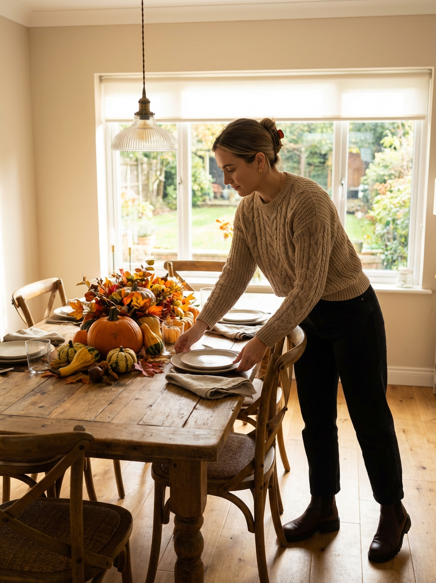 model setting holiday table, beautiful autumn centerpiece, elegant casual attire, hosting preparation