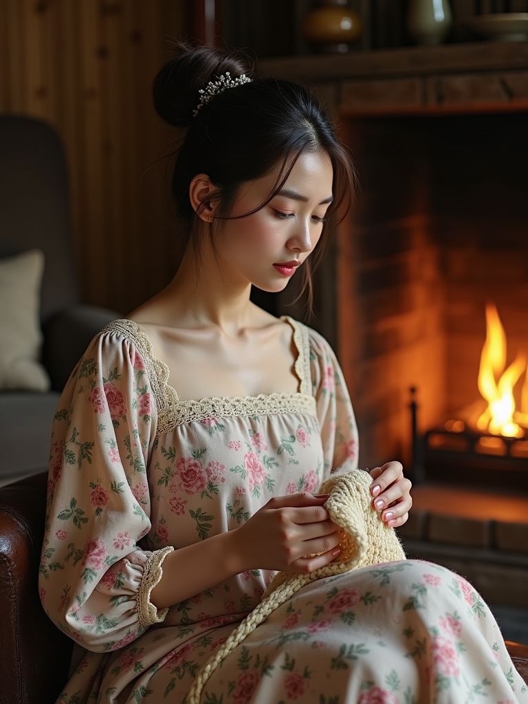 model sewing or knitting by the fireplace in a rustic living room, wearing a floral print dress with a lace collar, hair in a neat bun, with soft lighting around